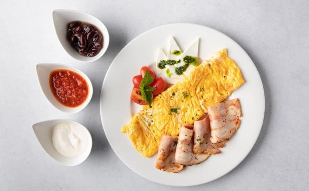 Omelette with turkey or mushrooms, cheese, cherry tomatoes, fried beans, tomatoes, sour cream, pesto sauce