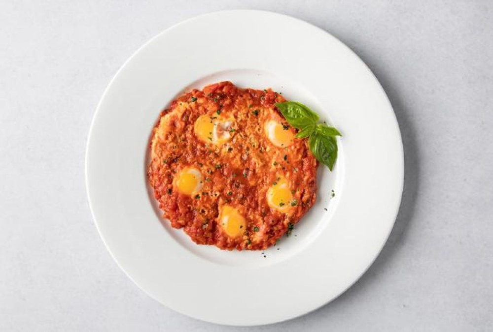 Яичница из яиц на подушке из томатного соуса с овощами по-домашнему