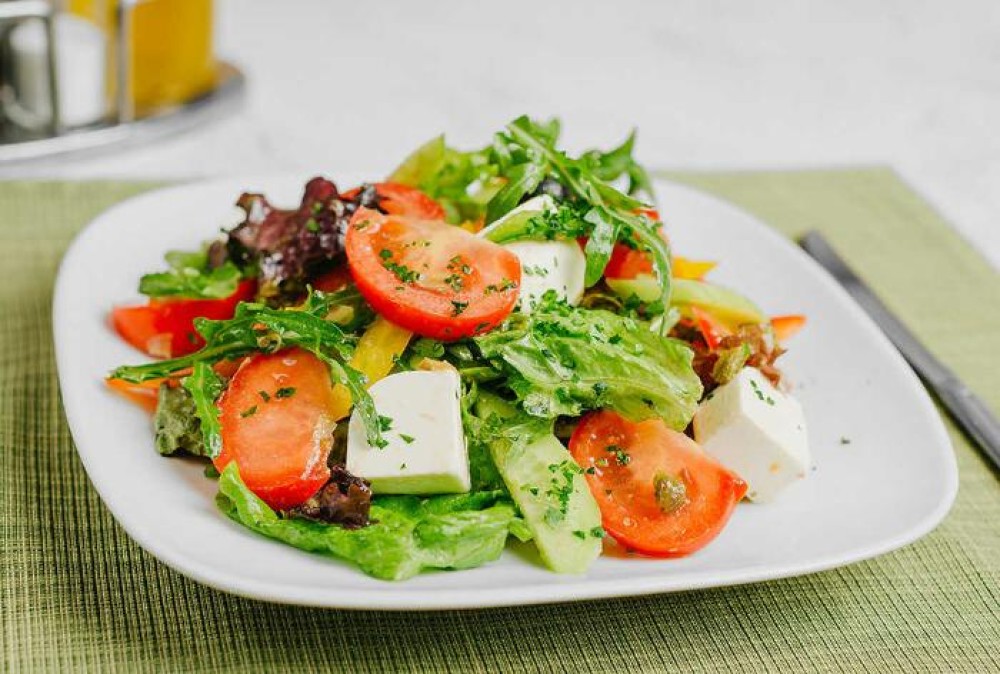 Традиционный греческий салат из свежих овощей с салатными листьями Микс, в сочетании с кусочками сыра Фета