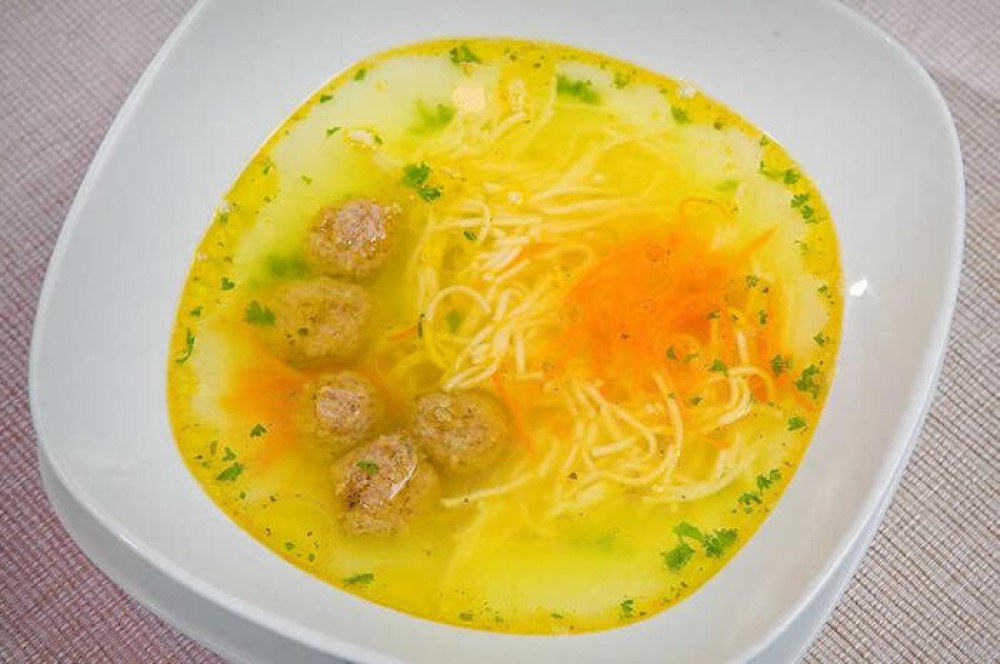 Домашний суп с лапшой на основе говяжьего бульона с фрикадельками