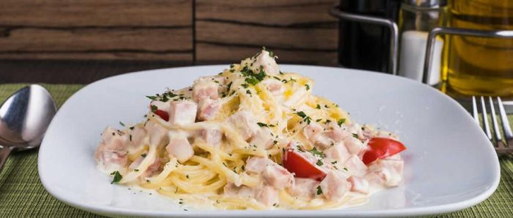 Нежная и очень вкусная паста, готовится по-особенному рецепту на основе полукопченой индейки. Особенность пасты в том, что паста тушится вместе с индейкой, томатами черри в сливочном соусе и впитывает в себя все ароматы ингредиентов. Подается с сыром Parmigiano Reggiano.