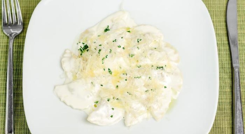 Традиционная итальянская фаршированная паста в форме полумесяца с начинкой из говяжьего мяса и овощей в сливочном соусе, с добавлением сыра Parmigiano Reggiano.