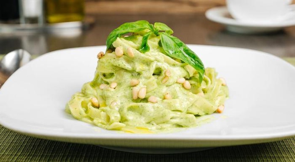 Традиционная паста тальятелле с нежным сыром маскарпоне в соусе песто и кедровыми орехами. Особенное сочетание соуса песто с сыром маскарпоне придают пасте необыкновенный нежный, воздушный вкусовой оттенок. Декорируется веточкой базилика.