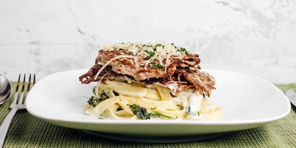Рекомендуем попробовать! Нежное филе говядины в виде небольших медальонов приготовленных на гриле в сочетании с традиционной пастой тальятелли в сливочно-шпинатном соусе с добавлением сыра Пармезан и петрушки