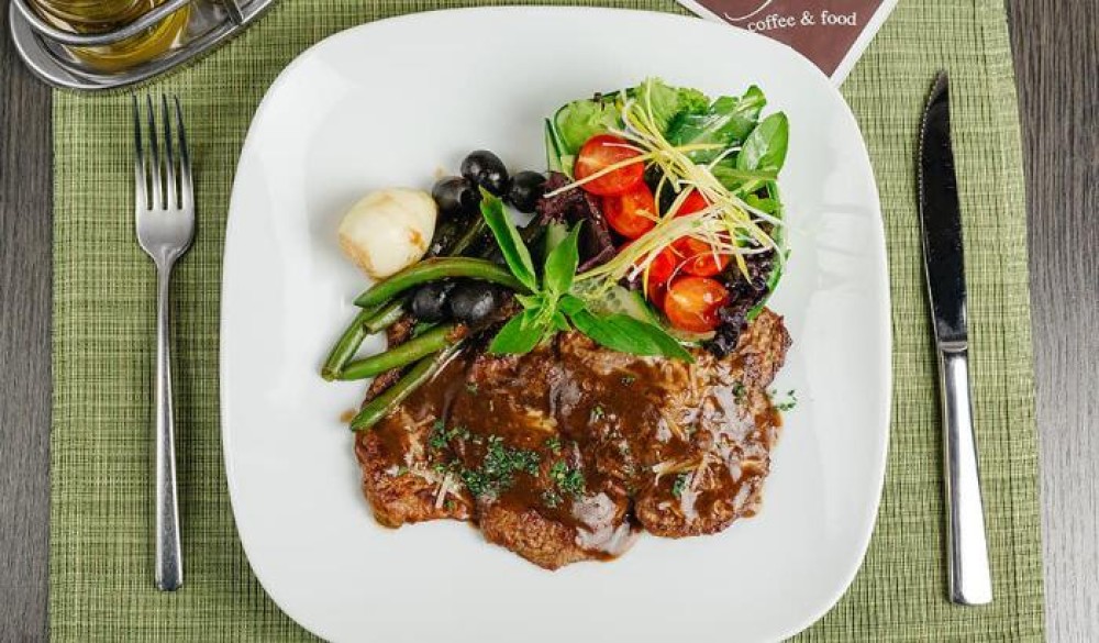 Нежное филе говядины в виде небольших медальонов, приготовленные по специальному рецепту, томленные в соусе Демиглас с добавлением тертого сыра Пармезан, стручковой фасоли, маслин. Украшается томатами черри