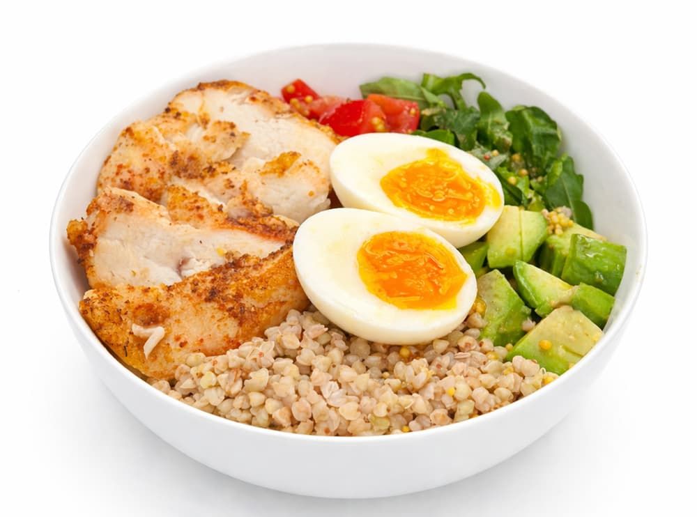 Куриная грудка, авокадо, томаты, руккола, яйцо, гарнир на выбор