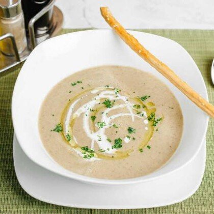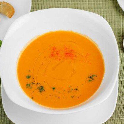 Полезный диетический крем-суп из сладкой тыквы на основе овощного бульона с добавлением трюфельного масла