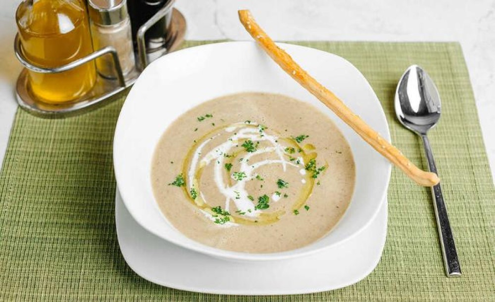 Нежный суп на основе овощного бульона и двух видов грибов: вешенок и шампиньонов.