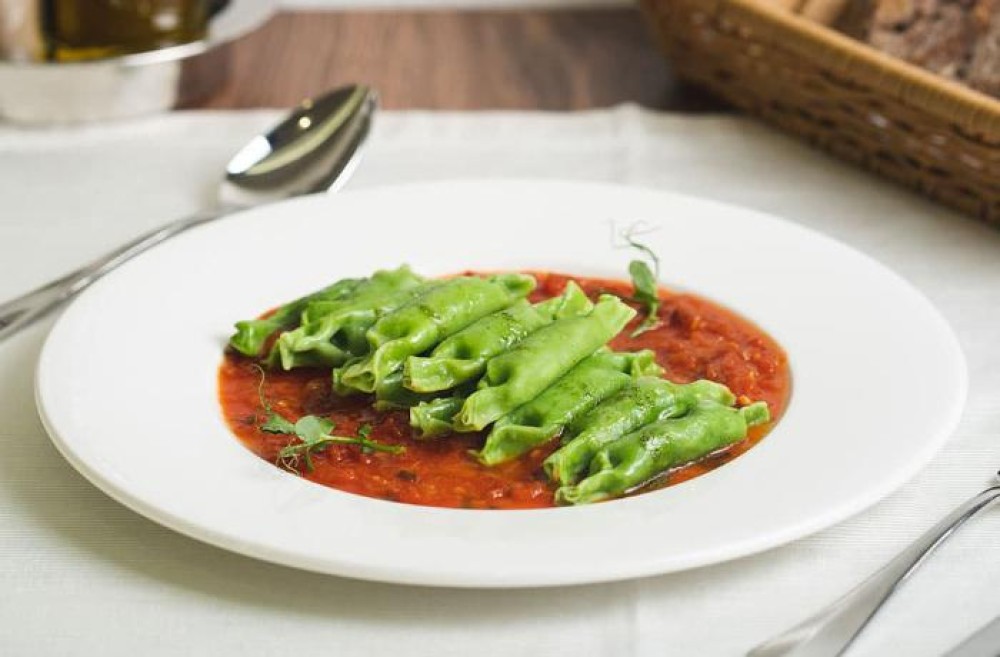Шпинатные равиоли с начинкой из семги в томатном соусе