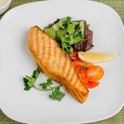 Запеченное филе лосося с кешью и грецкими орехами, подается с тушенными брокколи в сливочном-имбирном соусе с добавлением французской горчицы и томатов черри. Особенностью этого блюда является богатая комбинация вкусов.