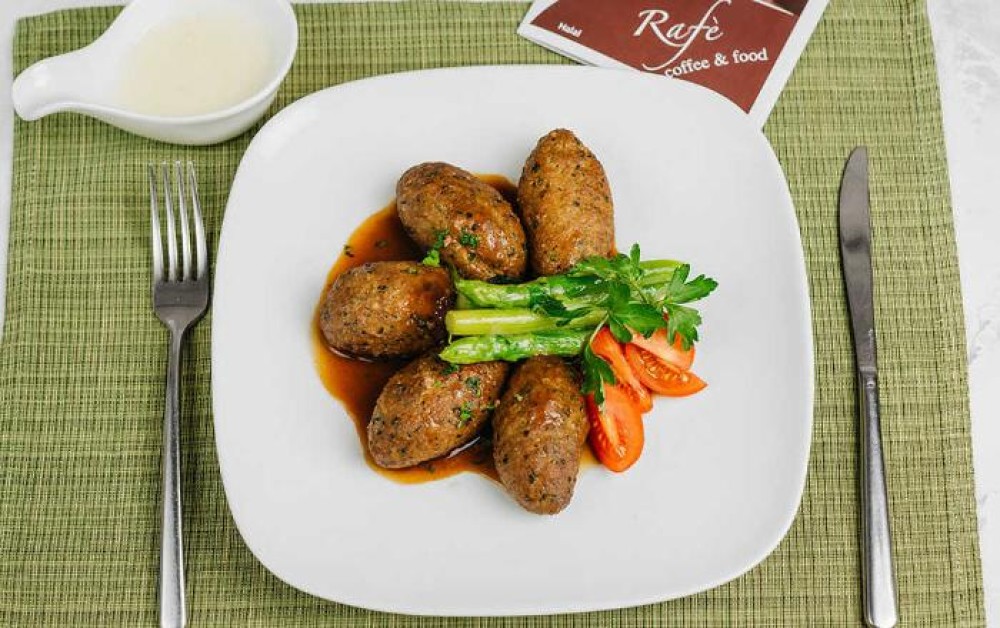Это нежные, запеченные мясные шарики из говядины и индейки, с добавлением тертого сыра Parmigiano Reggiano. Подаются на подушке из бланшированной спаржи, шпината и помидоров черри, c сырным соусом и соусом Демиглас.