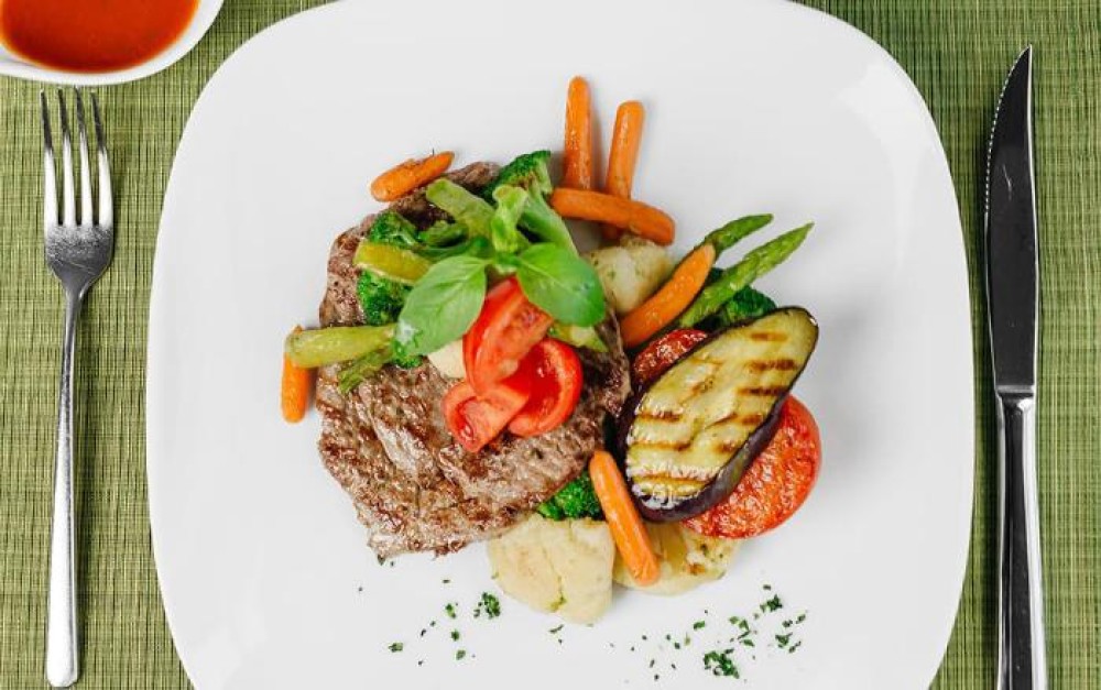 Нежная вырезка Тендерлойн приготовленная на гриле с баклажанами и помидорами в сочетании полезных микс-овощей, подаются с фирменным томатным соусом Rafe