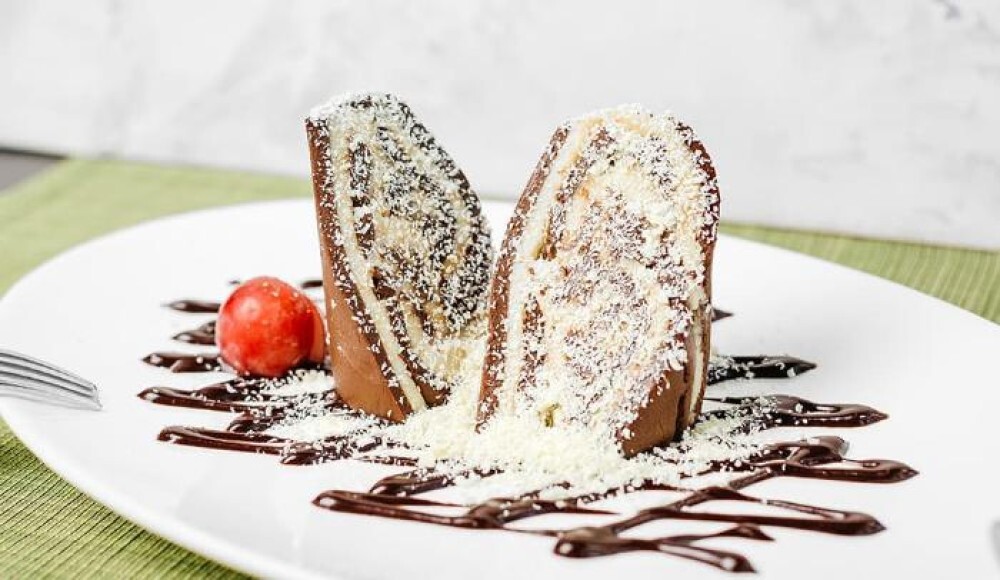 Нежный домашний рулет из черного и белого шоколада с шоколадной стружкой и шоколадным соусом. Хорошо сочетается с ароматным зеленым чаем.