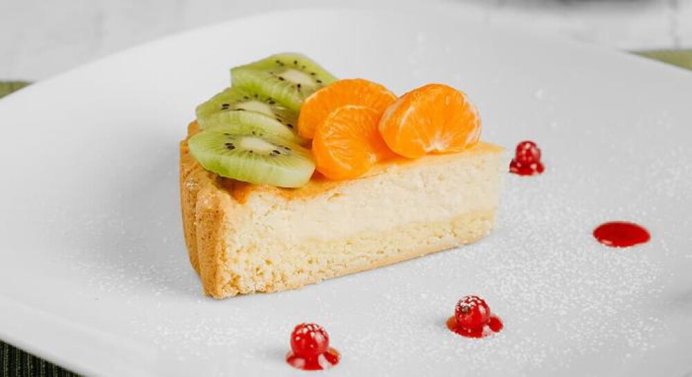 Вкусный и легкий пирог на основе тонкого песочного бисквита и творога в сочетании со свежими фруктами. Подается с ягодным соусом.